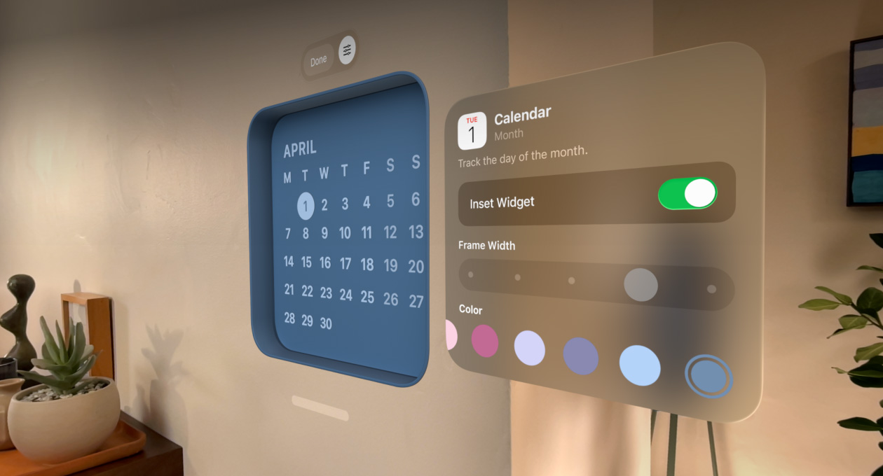 Keep your favorite widgets — like Photos, Clock, Music, and Calendar — just a glance away. Customize their frame thickness, color, and depth so your space is arranged the way you like it, every time you put on Apple Vision Pro.