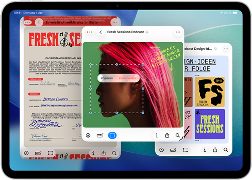 Ordne Fenster mit einem Streichen nach links oder rechts an. Und du kannst dein iPad Display jetzt auch in Drittel oder Viertel aufteilen.