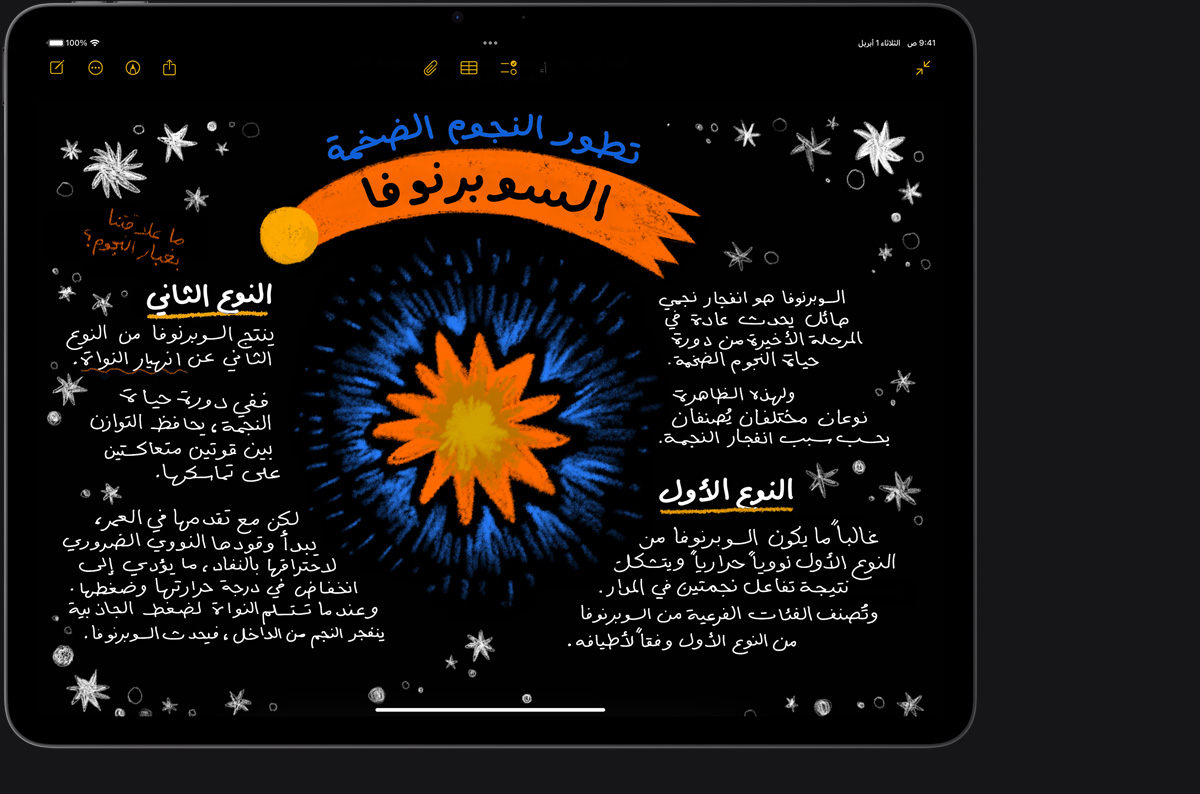 يخط قلم Apple معايير جديدة في الرسم والتلوين والكتابة باليد وتدوين الملاحظات لتستمتع بتجربة في منتهى السلاسة والدقة والروعة بشكل ملموس. كل ذلك بدقة بكسل متناهية ومدة انتقال منخفضة واستجابة للميل ودعم تكنولوجيا تجاهل راحة اليد. ويأتي قلم Apple Pro‏ بالمزيد من القدرات لتنطلق بأفكارك إلى أبعد مما يتصوره خيالك.‏‏3