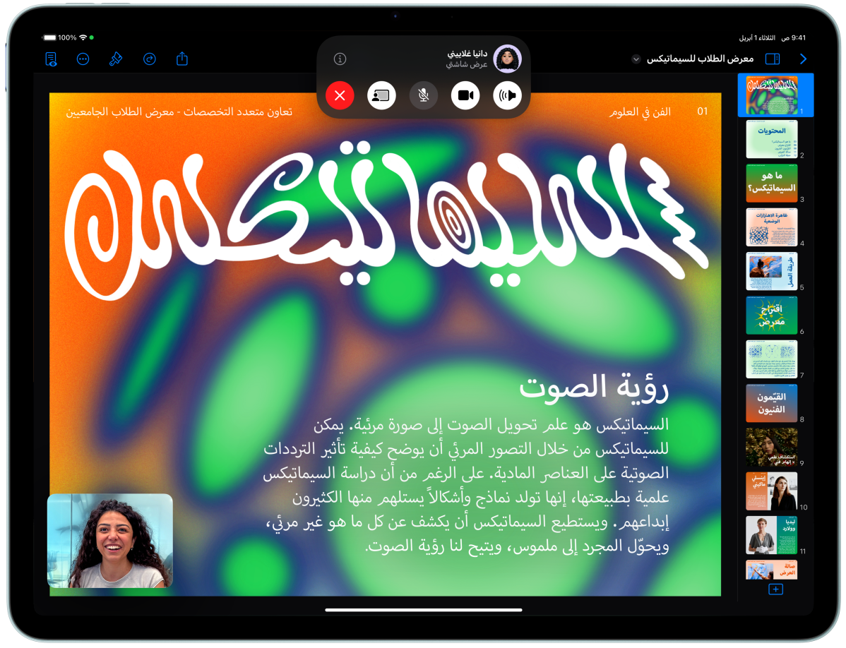 عرض أفقي لجهاز iPad Air يُبرز Apple Intelligence مع عالم الصور، وKeynote، وقلم Apple Pro‏
