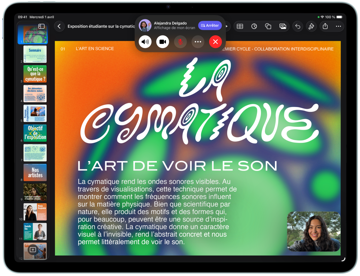 iPad Air, vu de face, la personne utilisatrice est sur FaceTime et en train de consulter Keynote, un autre iPad Air vu de dos est en arrière-plan
