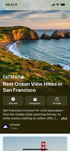 Les guides vous donnent plein d’idées de choses à faire ou à voir dans des villes du monde entier5. Touchez le bouton Explorer des guides pour accéder à une centaine de guides soigneusement élaborés, puis enregistrez ceux qui attirent votre attention. Les guides recommandés s’actualisent automatiquement dès que de nouvelles adresses y sont ajoutées, afin de vous offrir en permanence les toutes dernières recommandations. Vous pouvez aussi vous constituer vos propres guides et en faire profiter vos proches.