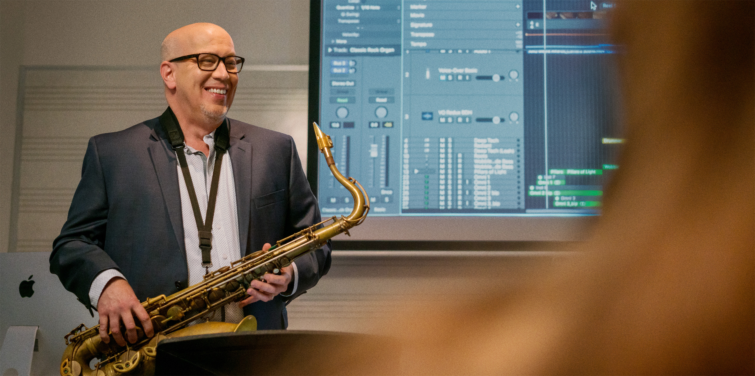 MacBook Pro。Hughes氏が、クリエイターやプロデューサーとして成功を収めるための準備を安心して任せているのが、オールインワンのこのプロフェッショナルツールです。MacのLogic Proは、音楽とサウンドデザインを教えるHughes氏のカリキュラム全体を支えています。学生たちは、プロレベルの音源集を使ってあらゆるジャンルの音楽を録音、編集、ミキシングする方法を学び、プロクオリティの作品集を制作して音楽業界での成功を目指します。