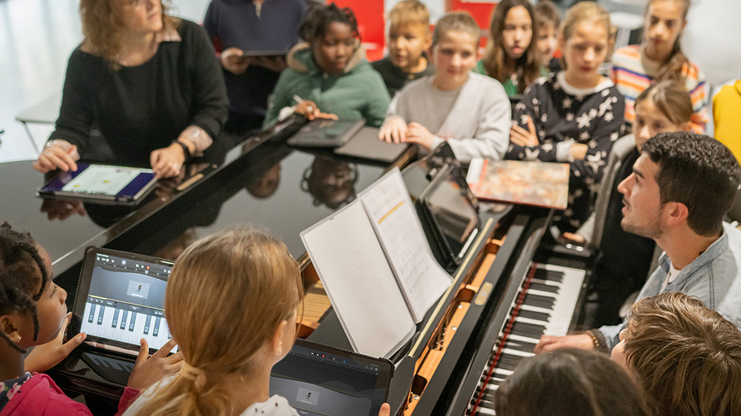 이렇듯 교사들이 색다른 학습 방식을 교실에 도입하자 학생들도 무럭무럭 성장하기 시작했습니다. 음악 시간에는 학생들이 피아노 주위에 모여 직접 연주할 곡을 Pages와 Apple Pencil로 작곡합니다. GarageBand를 활용해 악기를 연주하는 다른 반 친구들과 함께 자신만의 사운드를 만들고 녹음하기도 하죠. 코딩 수업 시간에는 iPad에서 CoSpaces Edu를 활용해 3D 콘텐츠를 만들고, Swift Playground로 AR 및 VR 환경에서 애니메이션을 제작합니다.