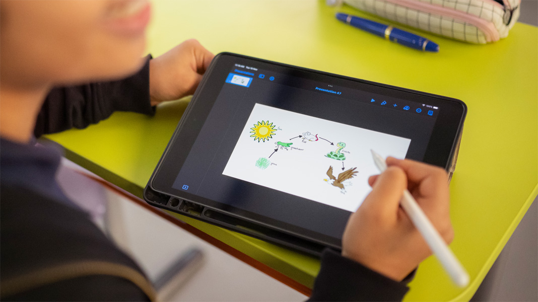 생물학 수업 시간에 학생들은 상호의존적 먹이 사슬 체계를 Keynote에서 움직이는 GIF로 만들어 생생하게 들여다보고, 교과 내용을 깊게 이해할 수 있습니다. 물론 그 과정에서 장차 도움이 될 창의적인 기술까지 익힐 수 있죠. 게다가 교실마다 Apple TV가 설치되어 있어 학생들이 자신의 창작물과 학습 내용을 다른 학우들과 쉽게 공유할 수도 있습니다.