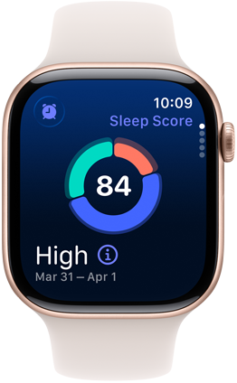 三款 Apple Watch 型號;中間的 Apple Watc 配備原色鈦金屬錶殼,錶面顯示回溯小工具的智慧型疊放提示;右方的 Apple Watc 配備午夜暗色錶殼,錶面顯示體能訓練 app 畫面;左方的 Apple Watc 配備玫瑰金色錶殼,錶面顯示睡眠分數畫面