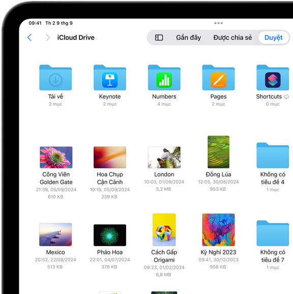 iCloud Drive giúp bạn dễ dàng truy cập và chia sẻ các tập tin và thư mục đã lưu, bất kể bạn đang sử dụng thiết bị nào. Bạn có thể truy cập tất cả các tập tin của mình, từ ứng dụng Tệp trên iOS và iPadOS, Finder trên Mac, File Explorer đối với PC sử dụng Windows, hoặc trên iCloud.com.